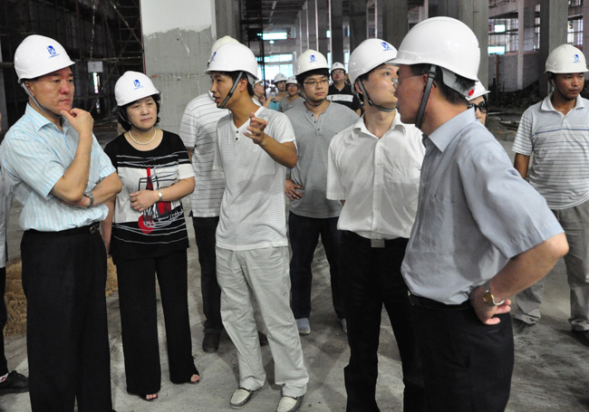 一到现场,展现在眼前的宏伟壮观的景象令每一个人震撼:整个厂房长800米宽200米,近800个工人们顶着烈日热火朝天地忙碌着。严总一行首先察看了在建中的鲜奶车间工地,仔细询问了人员工作情况、现场安全管理情况和施工进度。该项目作为上海市重点项目和国家级重大项目,体量大、工期紧,业主要求也非常严格,项目团队凭借高度的责任感,运用自己的智慧与经验,克服各种困难,使项目有序地推进。在现场,大家对管理的井然、梁柱的挺括不时发出啧啧称赞。