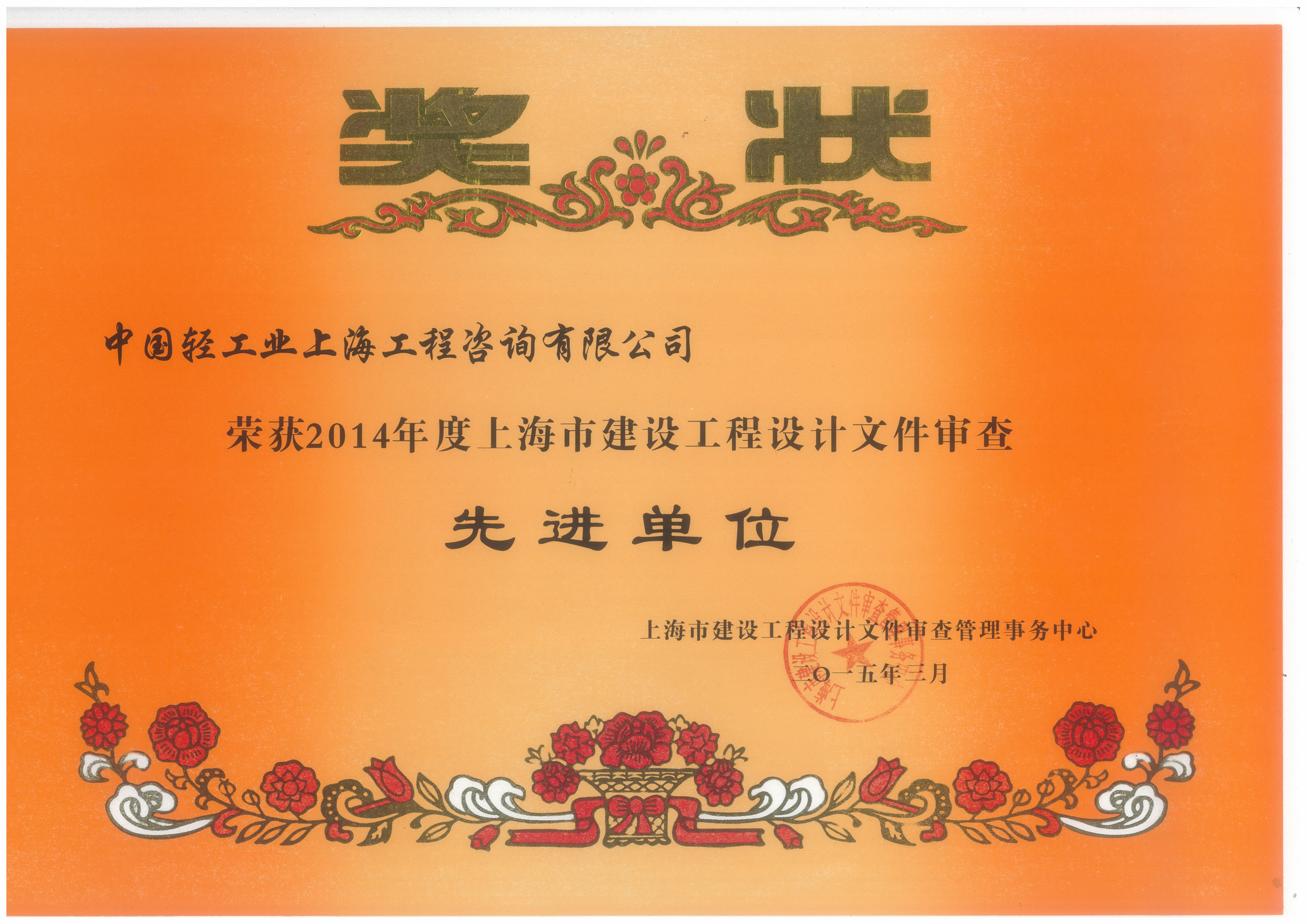 中国轻工业上海工程咨询有限公司获评“2014年度上海市建设工程设计文件审查先进单位”