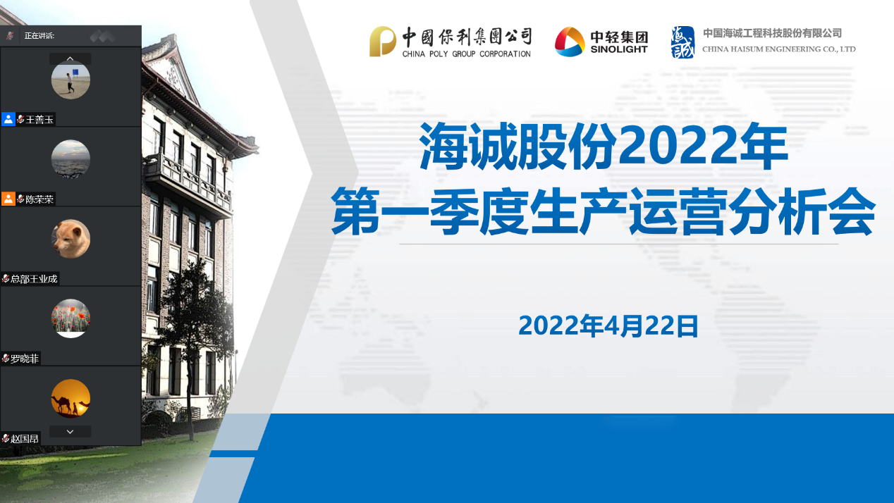 2022年4月22日,bw必威西汉姆联官方网站以视频形式召开2022年第一季度生产经营分析会,深入贯彻保利中轻2022年一季度工作会决策部署,全面总结一季度工作,研究部署下阶段重点任务。bw必威西汉姆联官方网站党委书记、董事长赵国昂视频参会并作讲话,党委副书记、总裁陈荣荣主持会议。公司领导班子成员、总部部门负责人、上海本部和各子公司领导班子成员及财务、数字化、生产运营等相关人员在各分会场参加会议。
