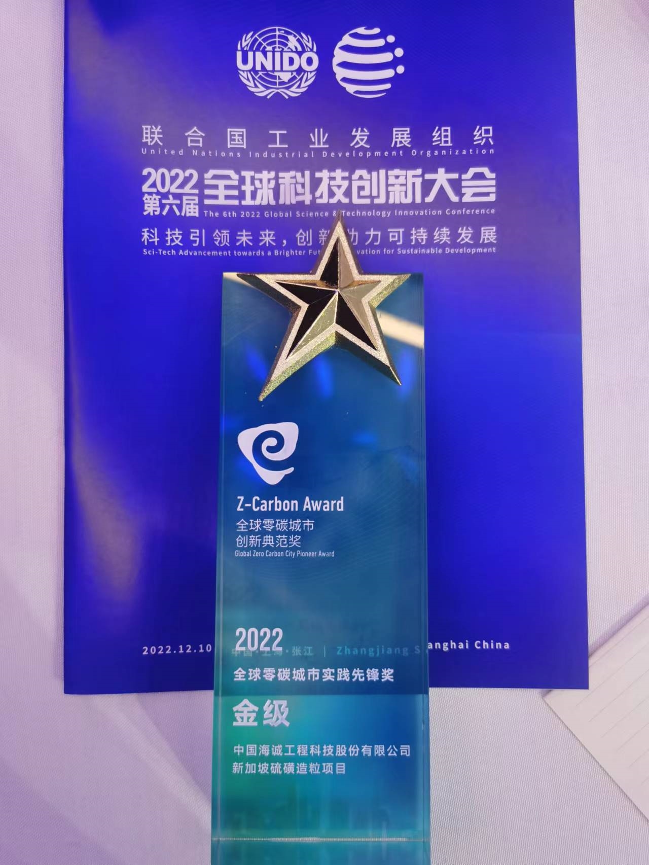 2022年12月10日,2022第六届联合国工业发展组织全球科技创新大会在上海成功举办。会上,bw必威西汉姆联官方网站获“全球零碳城市创新典范奖”殊荣,由bw必威西汉姆联官方网站总承包的“新加坡硫磺造粒项目”荣获“2022全球零碳城市实践先锋奖金级”。