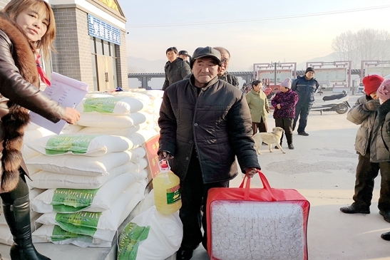 24日清晨,在副旗长迟亚玲等旗有关负责同志陪同下,慰问组赴王爷府镇希庄村,代表中轻集团向希庄村捐赠产业扶贫资金22万元,并为70岁以上老人送上米、面、油和保暖棉被等物资。王珂灵在寒冬中发表热情洋溢的讲话,传递中轻集团党委的深情厚谊,温暖了贫困群众的心田。