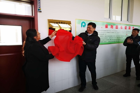 随后,慰问组来到王爷府镇蒙古族学校,参加保利集团·中轻集团“保利爱心图书馆”揭牌仪式。中轻集团总经理助理、党委办公室主任肖金龙代表集团公司为图书馆揭牌,并捐赠价值1万元的阅览桌椅和4000册爱心图书。