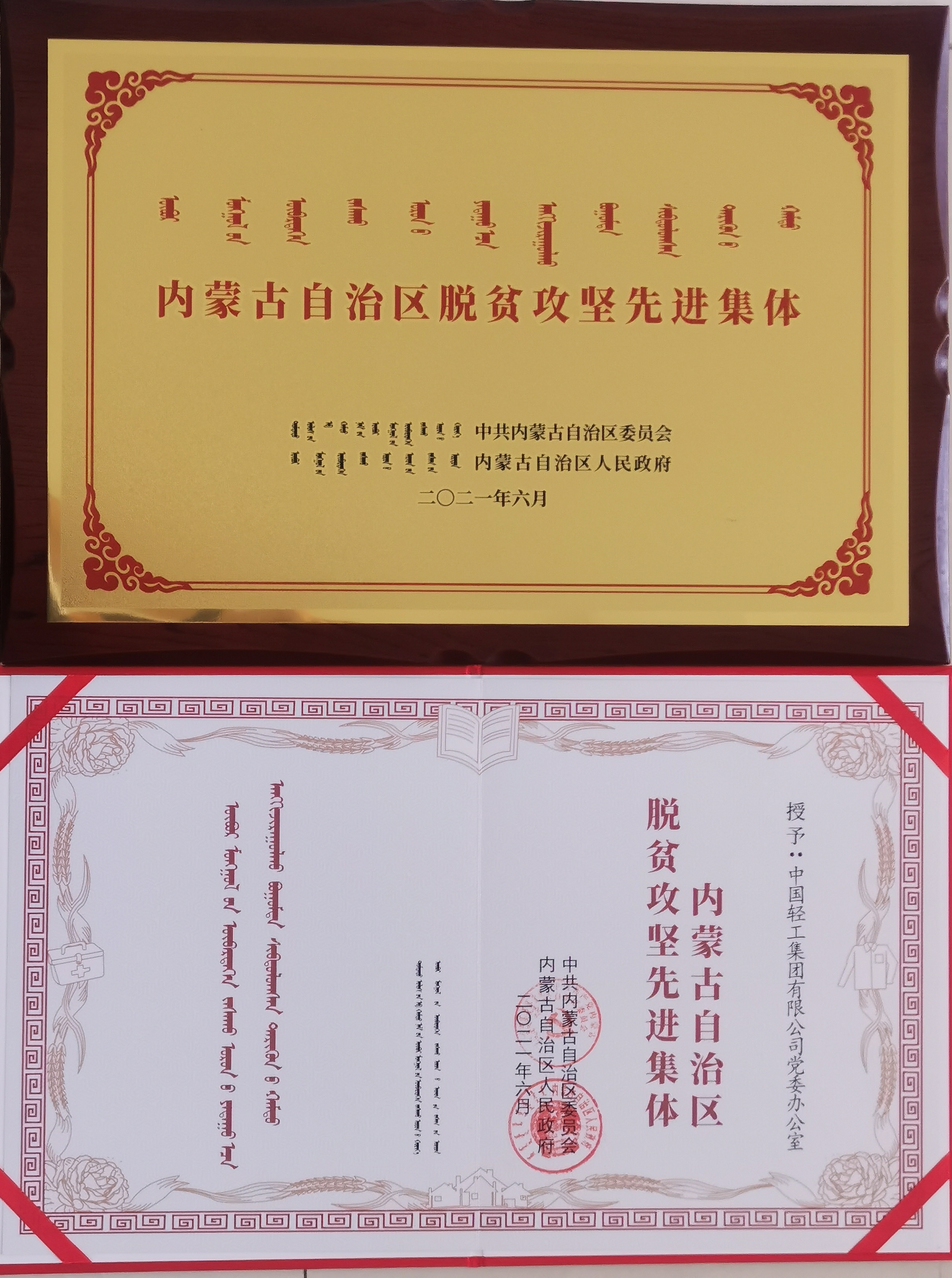 为表彰保利中轻党委在喀喇沁旗脱贫攻坚中的突出贡献,2021年内蒙古自治区党委政府授予保利中轻党委办公室“内蒙古自治区脱贫攻坚先进集体”称号,其中挂职干部王军辉荣获2021年度“喀喇沁旗优秀共产党员”,刘为在2021年公务员考核中评为“赤峰市优秀公务员”。