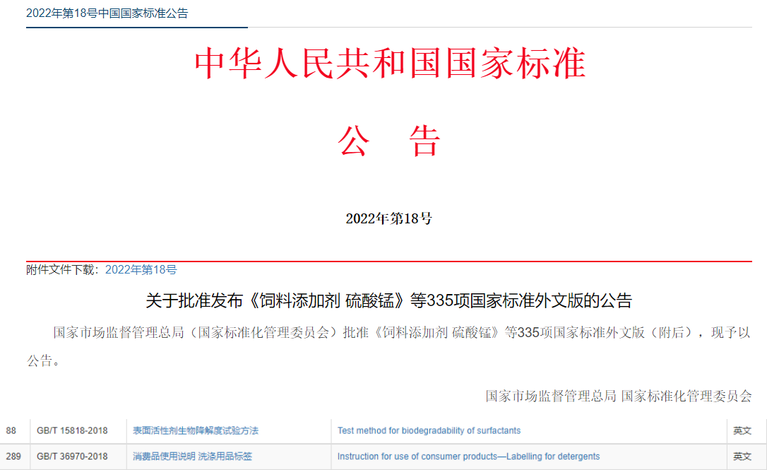 中国日用化学研究院制修订的《手洗餐具用洗涤剂》《卫生洁具清洗剂》等11项国家标准及《表面活性剂生物降解度试验方法》《消费品使用说明 洗涤用品标签》2项国家标准外文版获批发布。