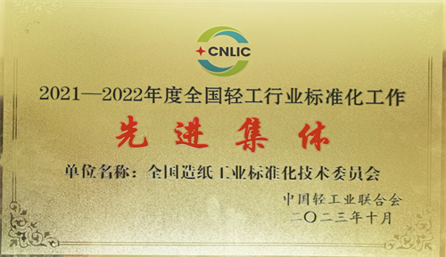 中国制浆造纸研究院荣获“2021-2022年度全国轻工行业标准化工作先进单位”称号;作为秘书处承担单位运营的全国造纸工业标准化委员会荣获“2021—2022年度全国轻工行业标准化工作先进集体”称号。