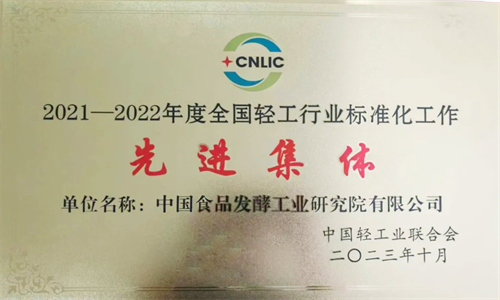 中国食品发酵工业研究院荣获“2021-2022年度全国轻工行业标准化工作先进集体”称号。