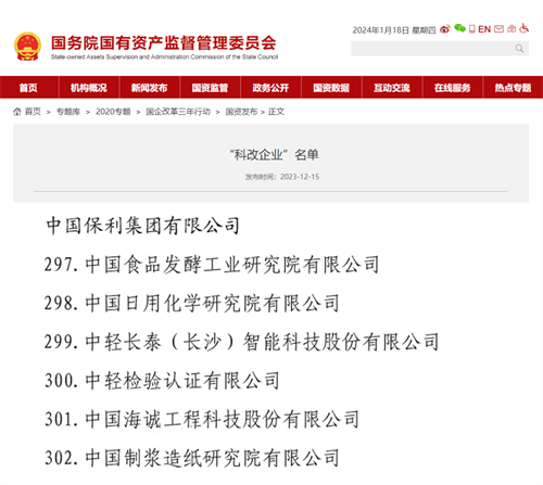中国制浆造纸研究院新入围国务院国资委“科改企业”名单,保利中轻科改企业增至6家。在国务院国资委年度专项考核中,中国食品发酵工业研究院、中轻检验被评为“标杆企业”,中国日用化学研究院、中轻长泰被评为“优秀企业”。