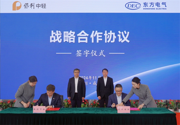 11月19日,保利中轻与东方电气集团国际合作有限公司(简称“东方国际”)在蓉签署战略合作协议。保利集团总经理助理,保利中轻党委书记、董事长安胜杰;东方电气股份有限公司副总裁,东方国际党委书记、董事长李建华出席仪式见证签约。