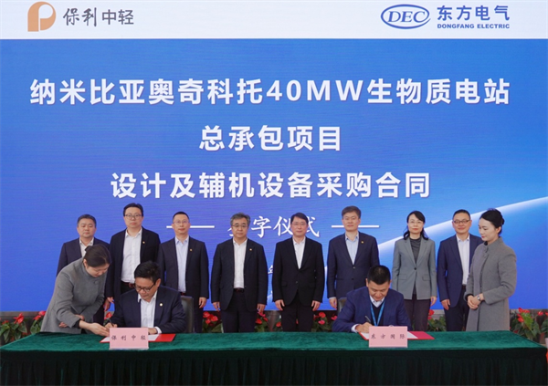 保利中轻副总经理、bw必威西汉姆联官方网站董事长赵国昂与东方国际副总经理周杰代表双方签署战略合作协议。bw必威西汉姆联官方网站副总裁罗军与东方国际机电事业部总经理杜晓东代表双方签署纳米比亚奥奇科托40MW生物质电站总承包项目设计及辅机设备采购合同。签约仪式前,双方就深化合作深入友好交流。