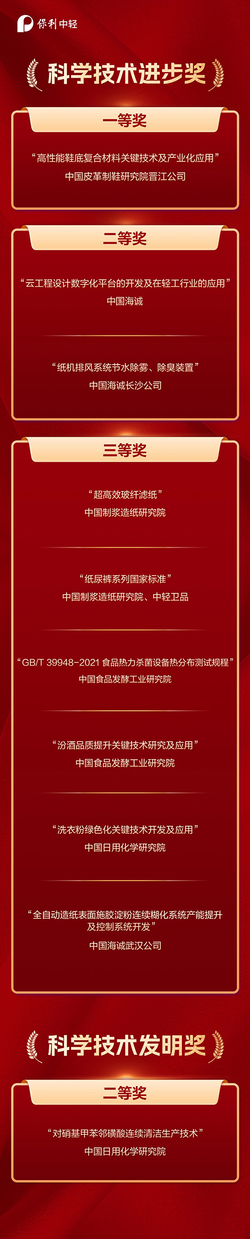 近日,“2024年中国轻工业联合会科学技术奖”评选结果正式揭晓。保利中轻荣获中国轻工业联合会科学技术进步奖一等奖1项、二等奖2项、三等奖6项,科学技术发明奖二等奖1项。