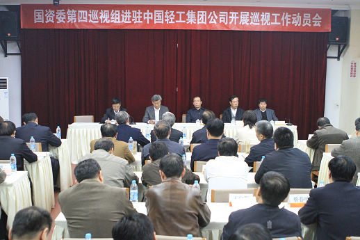 11月15日,“国资委第四巡视组进驻中国轻工集团公司开展巡视工作动员会”在集团公司总部召开。国资委第四巡视组组长路耀华,国资委监事会主席寻寰中,国资委巡视办副主任宋亚晨,国资委第四巡视组副组长熊晓先,国资委第四巡视组成员尹元、于学范、陈为群、张庆安、马洪兴、古海云、姚利军出席会议,集团公司党政领导班子全体成员,近年退休老领导,各部室负责人,各二级公司党政主要负责人,纪委书记、部分在京职工代表等共60余人参加了动员会。会议由集团公司总经理俞海星主持。
